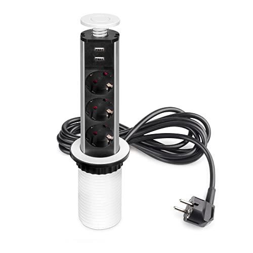 Multiprise escamotable à 3 prises avec 2 ports USB - Prise verticale de table - Multiprise encastrable - Tour multiprise en aluminium avec câble de 1,8 m - Pour bureau, cuisine, plan de travail
