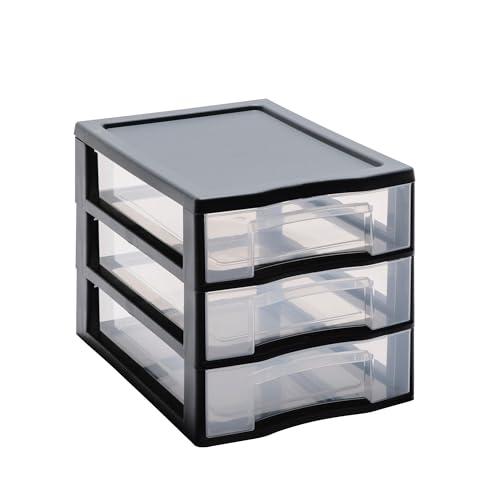 SUNDIS Tag Tower, petite tour de rangement en plastique noir, 3 tiroirs transparents format A6, hauteur 17 cm, superposable, idéale rangement cosmétiques, bijoux, accessoires, fournitures