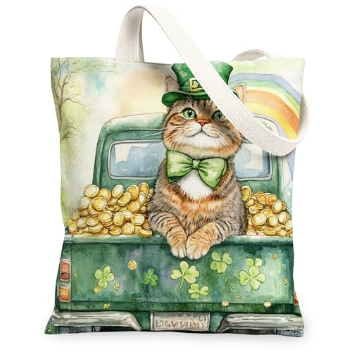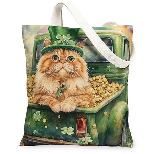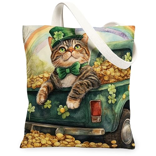 Sac fourre-tout réutilisable en toile motif chat Maine Coons de la Saint-Patrick pour faire du shopping, 33 x 38,1 cm, sac d'épicerie réutilisable pour femme, peinture esthétique arc-en-ciel