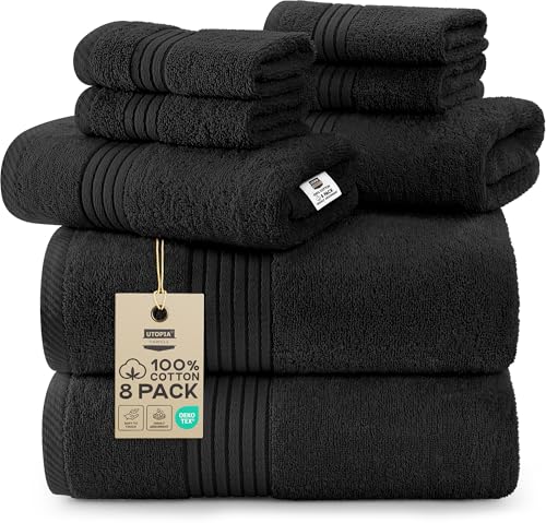 Utopia Towels – Lot de 8 Serviettes incluant 2 Serviettes de Bain, 2 essuie-Mains et 4 débarbouillettes, 100% Coton filé à l’Anneau Absorbant, pour Salle de Bain, hôtel, Sports, Noir