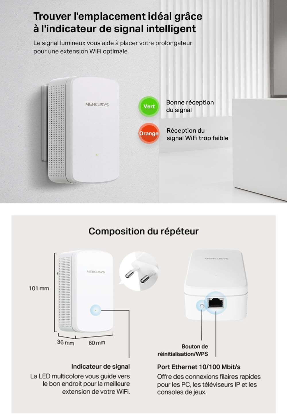 MERCUSYS ME10 N300Mbps WiFi Extender Booster, Easy One-Touch Setup, Internet Booster, port Ethernet, point d'accès, répéteur WiFi, extension WiFi TP-Link, contrôle de l'application facile
