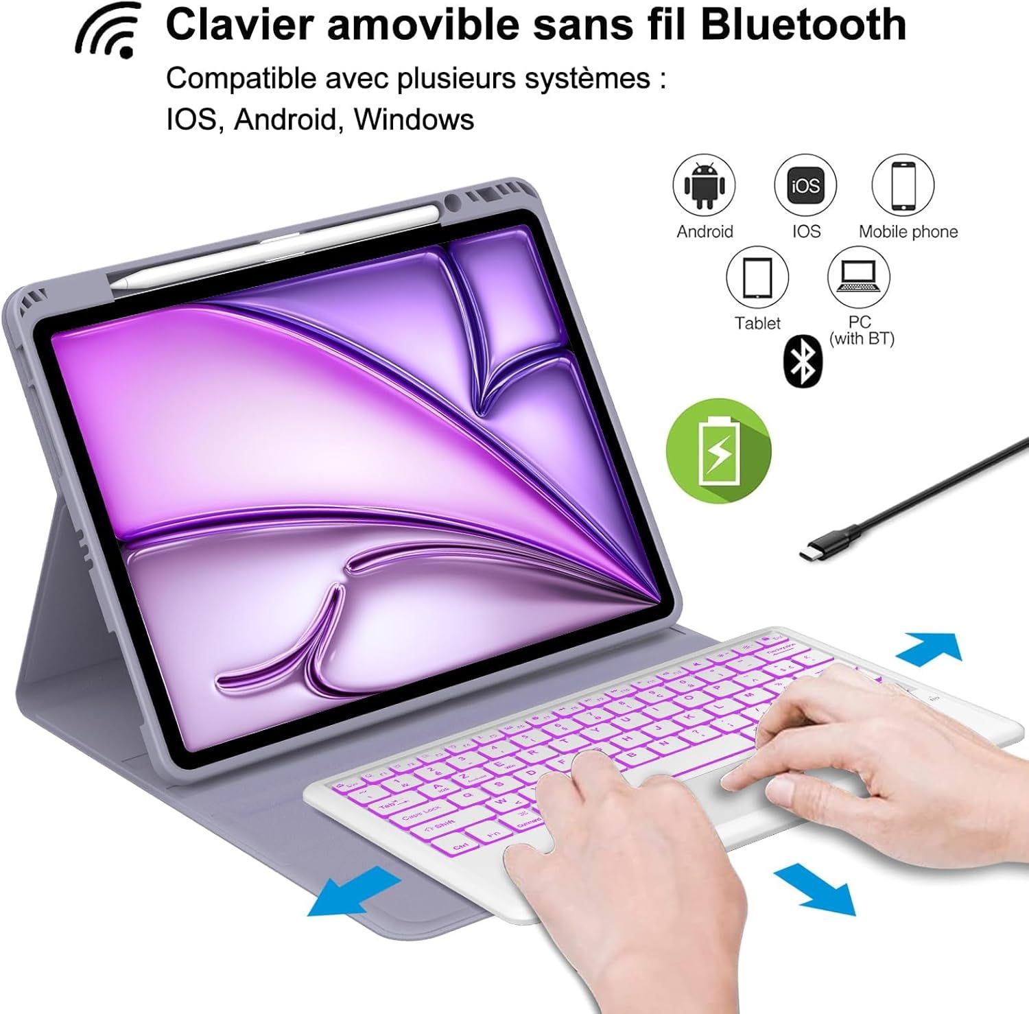 Clavier Pour Ipad Air 13 Pouces (M2 2024/M3 2025) Avec Pavé Tactile, Rétroéclairé 7 Couleurs Azerty Français Clavier Coque Trackpad Détachable Bluetooth Pour Ipad Air 13, Pourpre Lavande