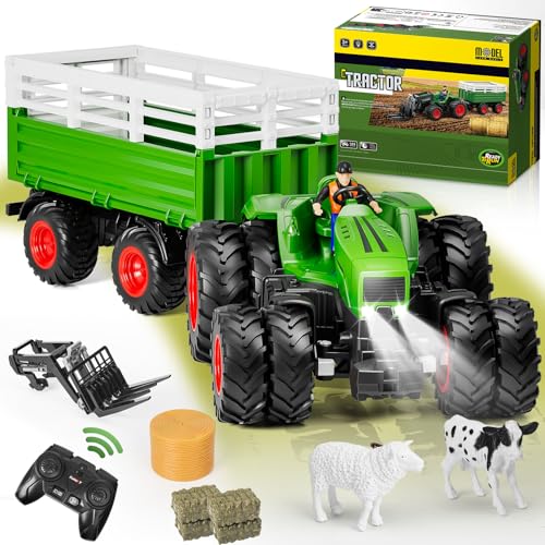 Orvyna RC Telecommandé Tracteur Enfant 2-8 Ans, Véhicules de Agricole Tracteur Jouet avec Lumière, Remorque, Levage, Vache, Mouton et Balle de Foin, Cadeau de Jouets Agricoles pour garçons et Enfants