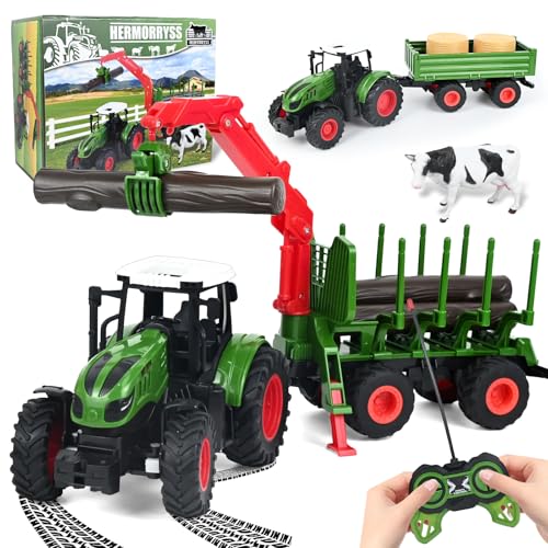 HERMORRYSS Tracteur Telecommandé Enfant 2.4Ghz, 1:16 Grand Tracteur Electrique Enfant avec Une Pince en Bois et Deux Types de Remorques, Jouets Agricoles pour Garçons et Enfants