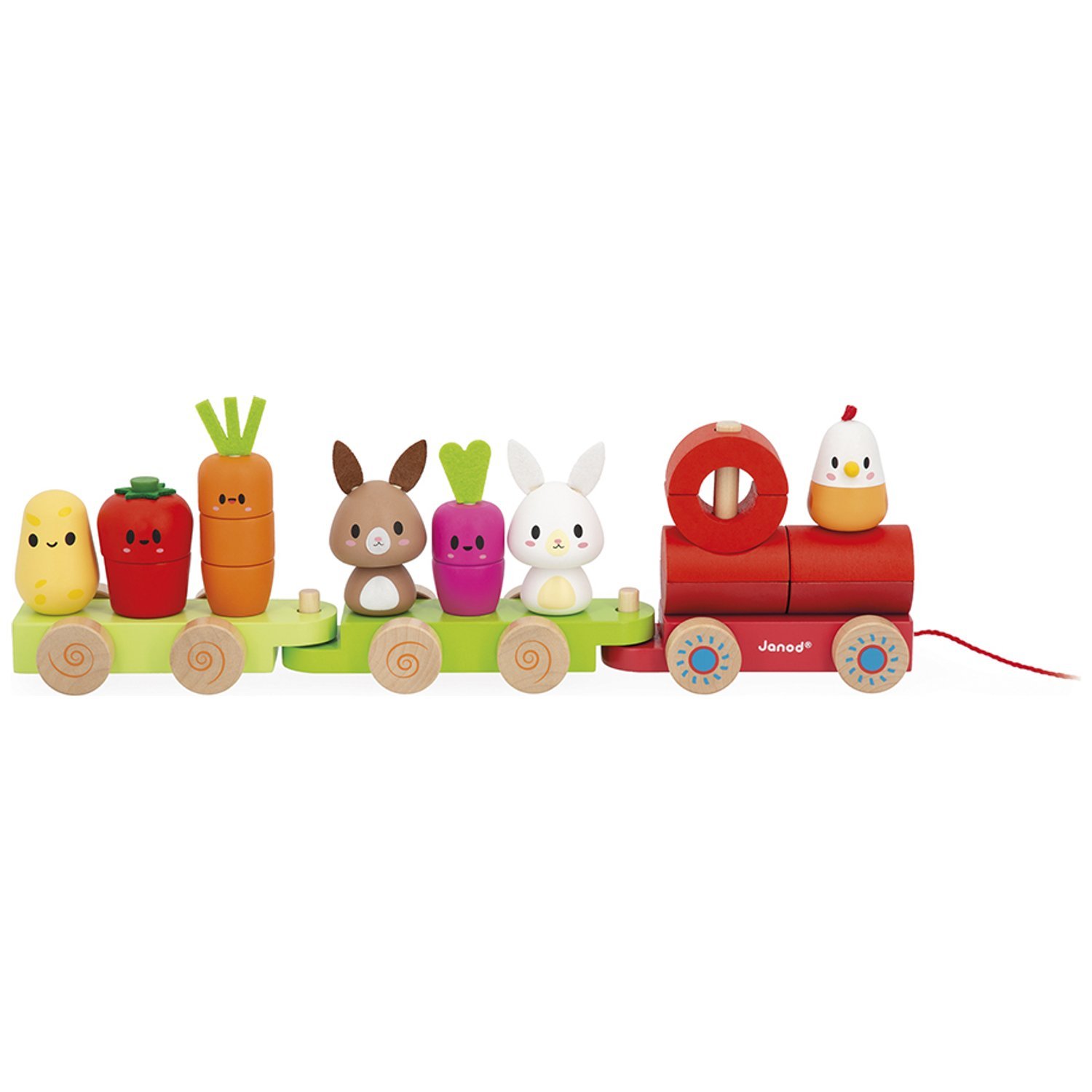 Janod - Train en Bois à Tirer - Thème Ferme - 3 Wagons et 19 Pièces - Jouet d'éveil à Tirer - Bois FSC et Peinture à l'eau - Développer la Motricité Fine - Dès 12 Mois, J03314