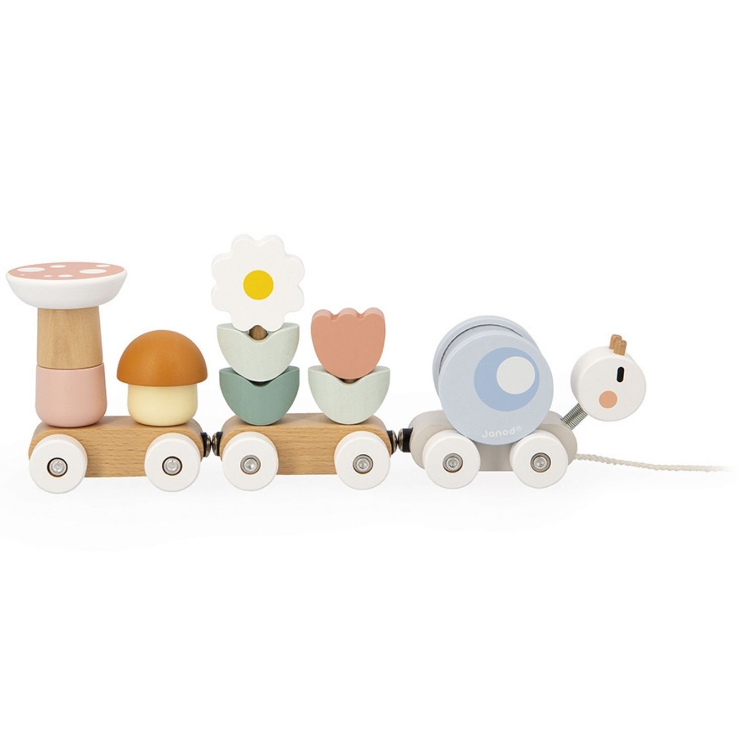 Janod - Train en Bois à Tirer Escargot - 2 Wagons et 10 Pièces Dont Hochet Amovible - Jouet d'éveil à Tirer - Bois FSC et Peinture à l'eau - Développer la Motricité Fine - Dès 12 Mois, J04010