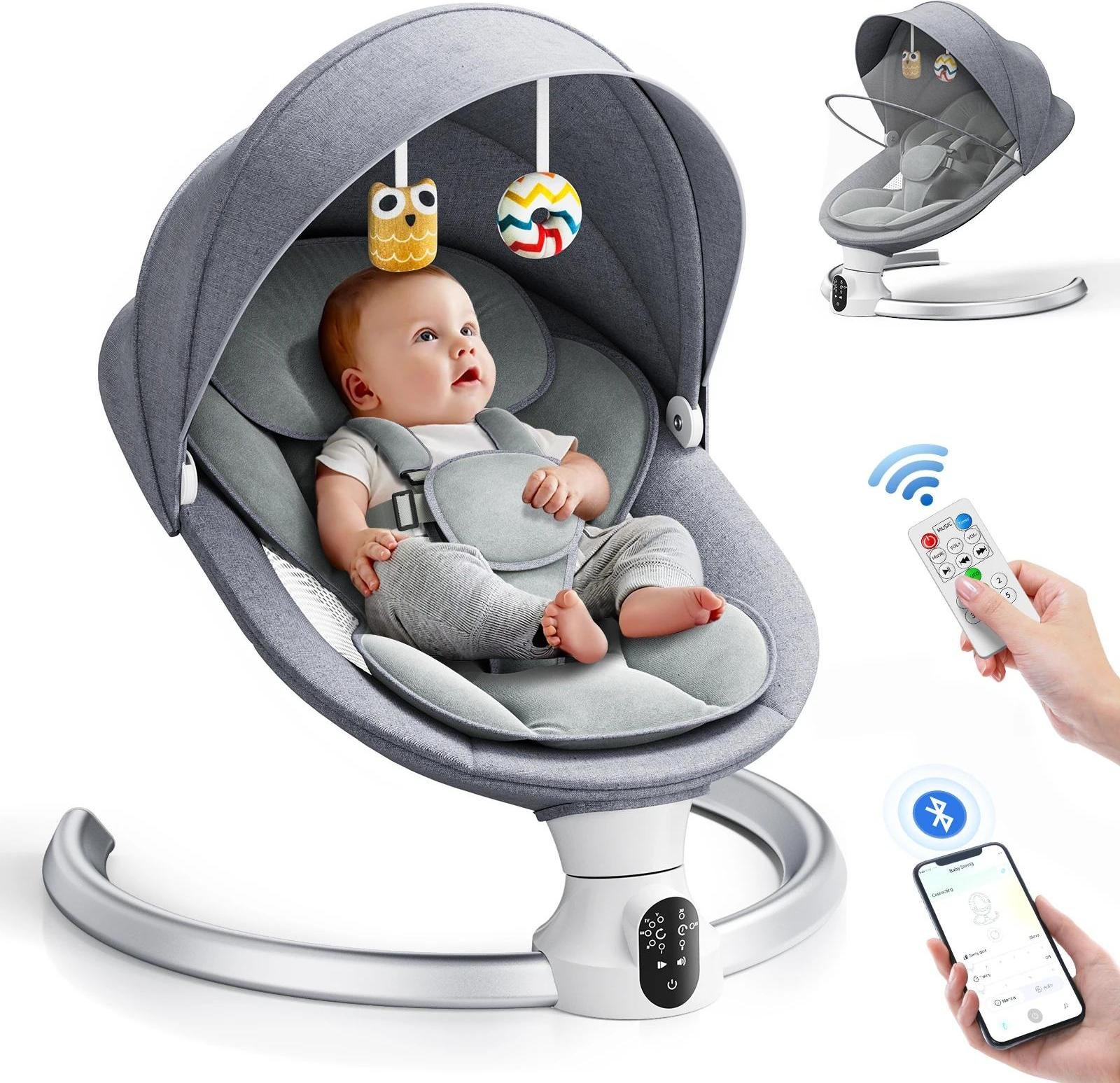 Balançoire électrique pour bébé - Transat -via smartphone - Alimentation par piles ou sur secteur - 10 mélodies - Harnais à 5 points - 0 à 6 mois - Jusqu'à 10 kg - Gris clair