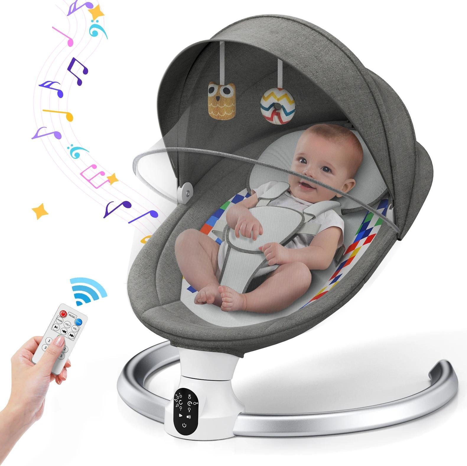 Balançoire électrique pour bébé avec Bluetooth - Transat pour bébé - Harnais 5 points - 5 vitesses - 3 minuteries - 10 mélodies - Jusqu'à 10 kg - Gris clair