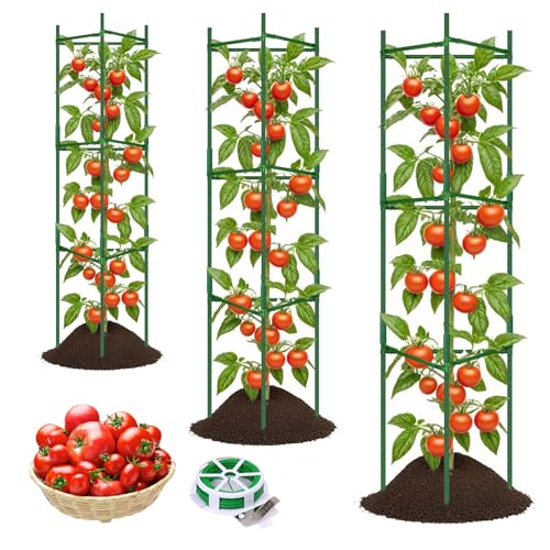 TOCCYARD Lot de 3 Cages à tomates pour Support de Plantes de Jardin, jusqu'à 122 cm, piquets de Jardin assemblés, Treillis de Plantes avec Attache torsadée de 20 m, Convient aux Plantes grimpantes