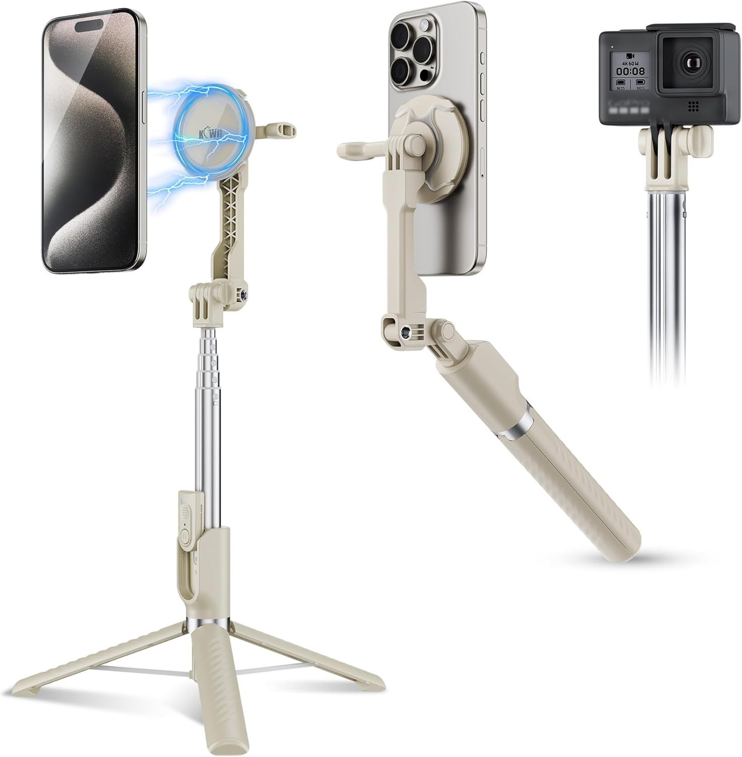 KIWIFOTOS Trépied magnétique pour iPhone MagSafe pour iPhone 16, 15, 14 Pro Max avec télécommande amovible pour voyage, selfie, vlogging, vidéo, trépied portable pour smartphone (beige)