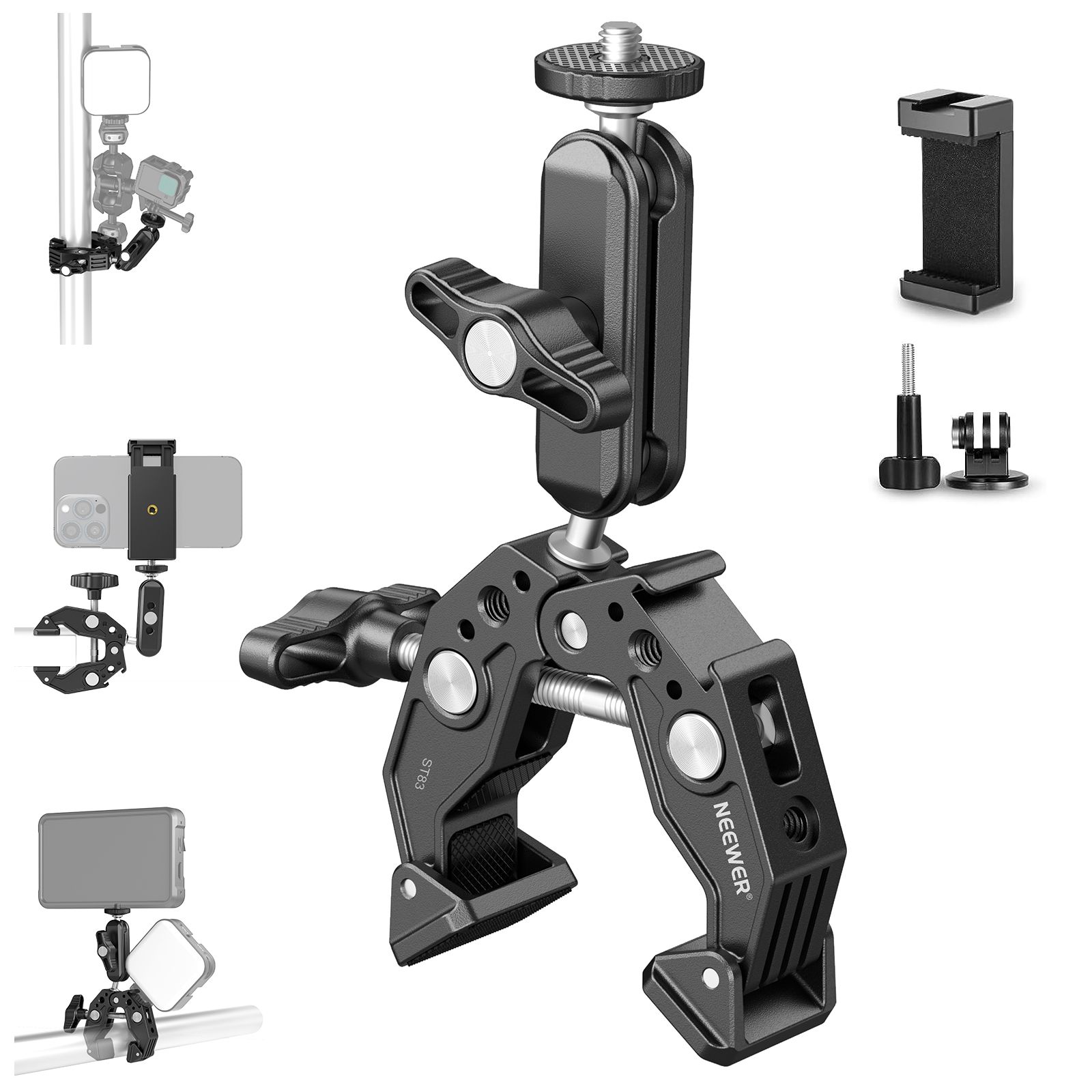 NEEWER Super Pince avec Bras Magique à Double tête sphérique de 7,6cm Griffe Froide Filetage 6,35mm Adaptateur Montage téléphone/action cam pour trépied Bureau Compatible avec SmallRig GoPro DJI, ST83