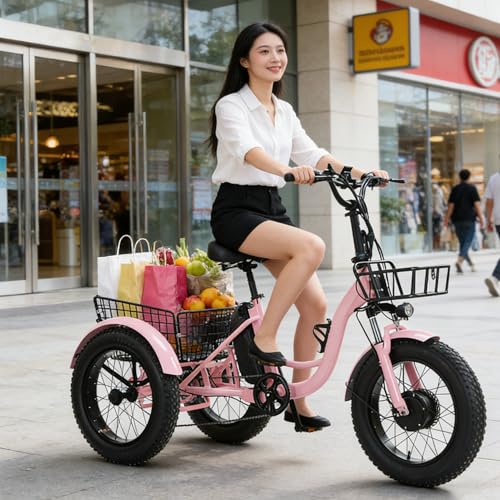 Tricycle électrique Adulte, Pneus Larges 20″ X 4.0 Pour La Neige,48 V 13 Ah (Autonomie De 35 Km), écran Lcd,Charge Maximale : 150 Kg, Idéal Pour Les Trajets Domicile-Travail Et Les Voyages Pink
