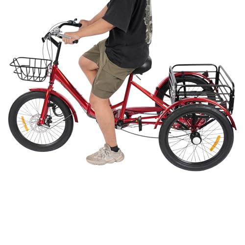 Donened Tricycle pliable de 24 ", 7 vitesses, 3 roues, avec panier dossier et porte-gobelet d'eau, 3 roues, pour adultes et personnes âgées, rouge