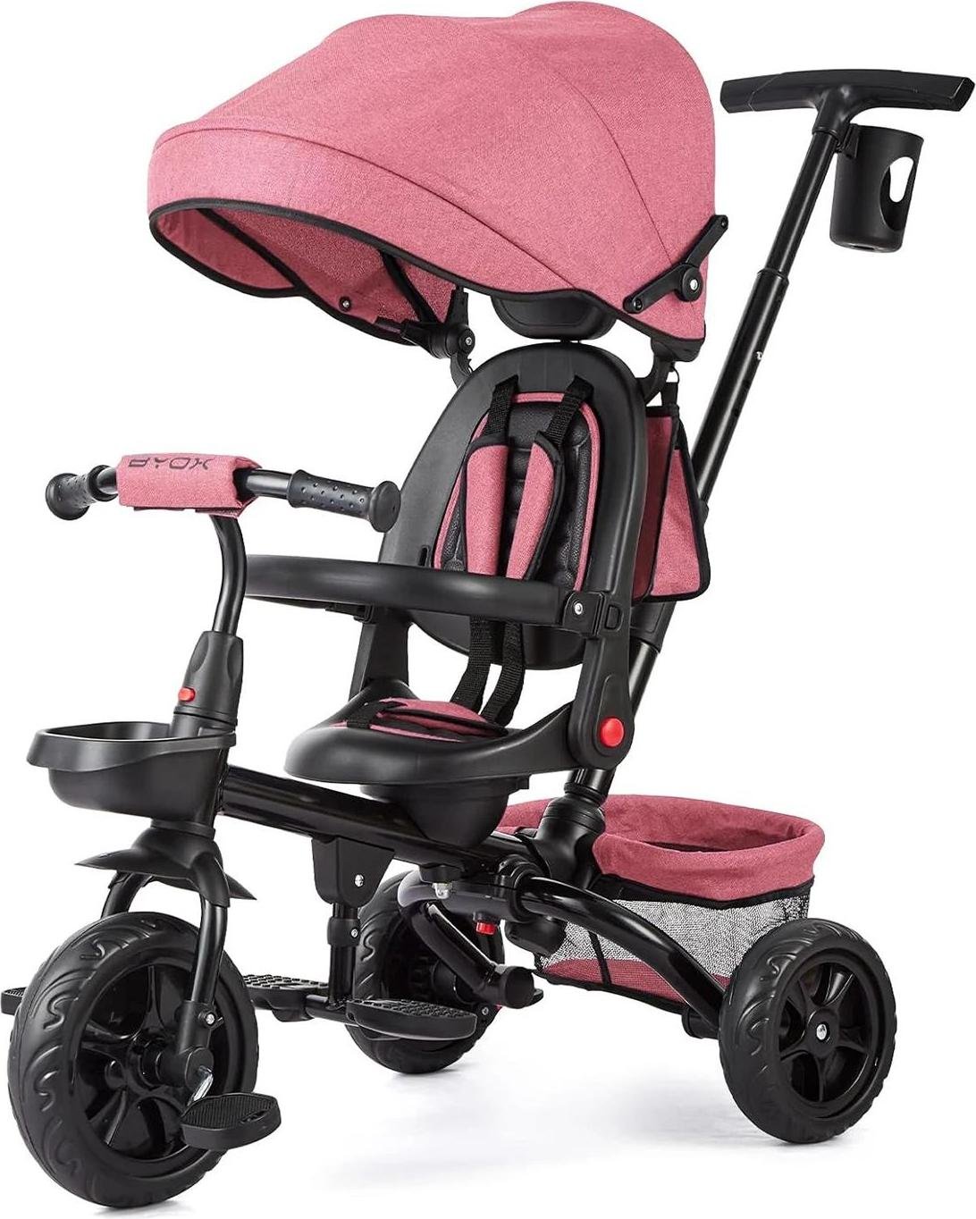 AIYAPLAY Tricycle bébé évolutif 6 en 1, Tricycle Enfant Pliable avec poignée parentale réglable et Capote Amovible, siège pivotant 360°, Poussette bébé avec Harnais de sécurité, Panier et Sac, Rose