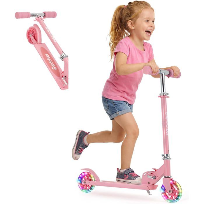 Trotinette Enfants à 2 Roues LED Roues Lumineuses Hauteur Réglable sur 4 Niveaux Légère et Pliable Pour Enfants 3-12 ans - Rose
