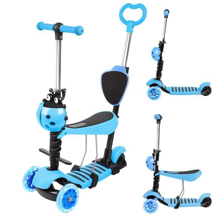 Trotinette Enfant 3 Roues de 2 à 10 Ans, Trottinette Evolutive Pliable,Trottinette Trois Roues avec LED Lumières Clignotantes et Guidon Ajustable,Réglable en Hauteur, 5 en 1 (A) Bleu