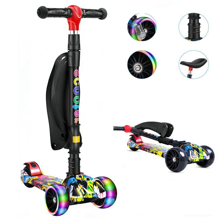 Kicknroll 2-en-1 Trottinette pour Enfants 3 Ans, Scooter Pliable & Hauteur Réglable avec Siège, 3 Roues à LED, Pont Antidérapant 50kg, Jouet Sport Extérieur, Cadeau pour Garçons & Filles de 3-10 Ans…