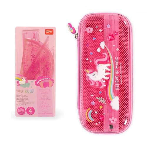 Legami Kit de géométrie avec règle de 15 cm, carré de 10 cm, rapporteur d'angle 180° pour l'école, avec valise, matériau flexible, Rose, Licorne + trousse
