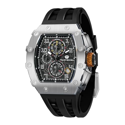 TSAR BOMBA Montre Homme 50M étanche Boîtier Tonneau en Acier Inoxydable Verre Saphir Bracelet en Silicone avec Fonction Fate Chronographe Mouvement à Quartz Japonais Cadeaux pour Hommes Mode Luxe