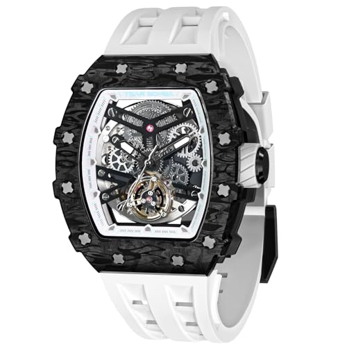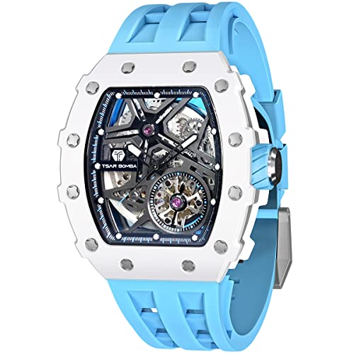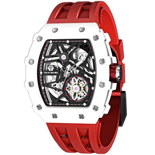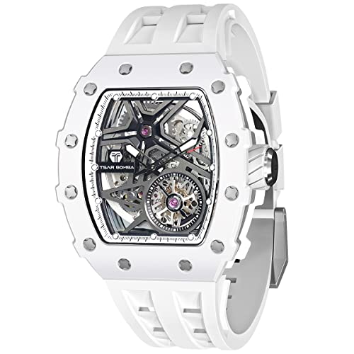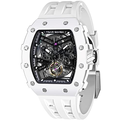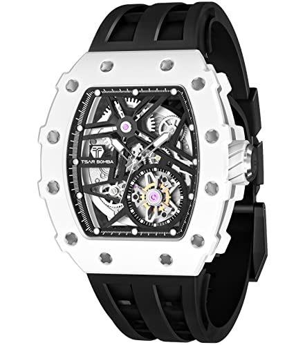 Tsar Bomba Montre Homme Automatique Squelette Mécanisme Apparent pour Homme Montre de Luxe Tonneau Saphir Etanche 50M Résistant Marque Rectangulaire Plongee Sport Militaire Cadeau Homme, Blanche,