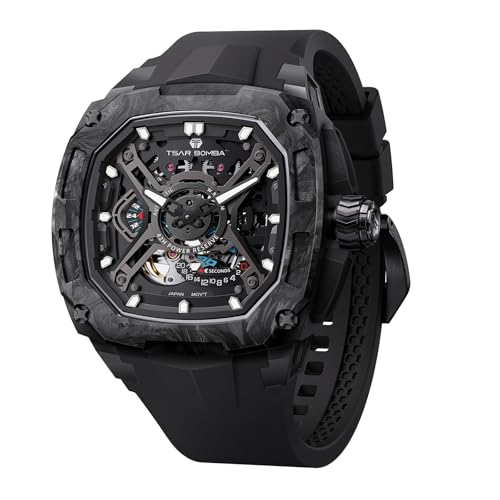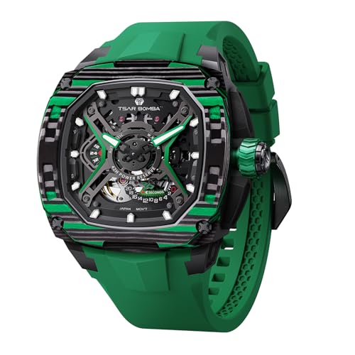 TSAR BOMBA Montre Homme Automatique - Montres Fibre de Carbone Tonneau de Luxe - Etanche 50m - Indicateur de Réserve de Marche - Bracelet en Caoutchouc Fluoré - Lumineux