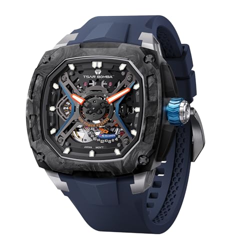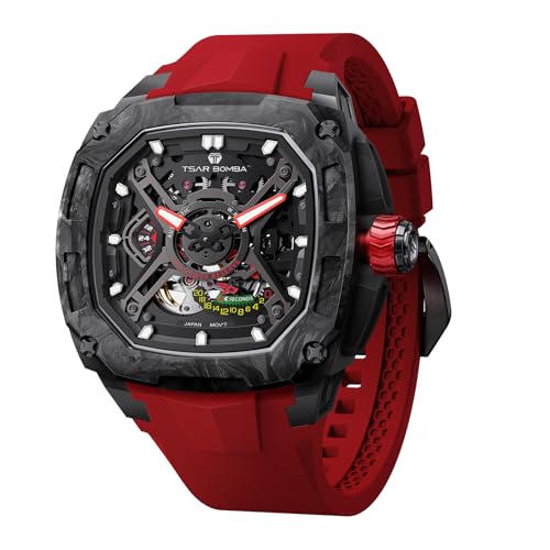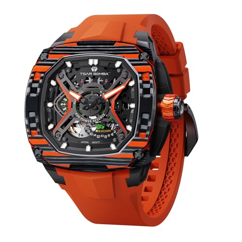 TSAR BOMBA Montre mécanique Luxe pour Homme avec Bracelet Caoutchouc fluoré étanchéité à 5 ATM Fonction luminescente boîtier Fibre Carbone Montres-Bracelets pour Hommes Cadeaux