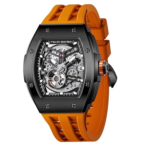 TSAR BOMBA Montres Homme Montres Automatiques pour Homme Tonneau Luxe Squelette Design Original Montre Grand Visage Carré Montre-Bracelet Bracelet en Silicone Unique Cadeau de Mode pour Hommes