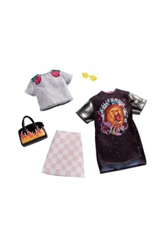 Barbie et ses amies ont fière allure dans ces tenues à la mode! L'ensemble comprend: 1 Chemise Oversize, 1 T-Shirt gris, 1 Jupe, 1
