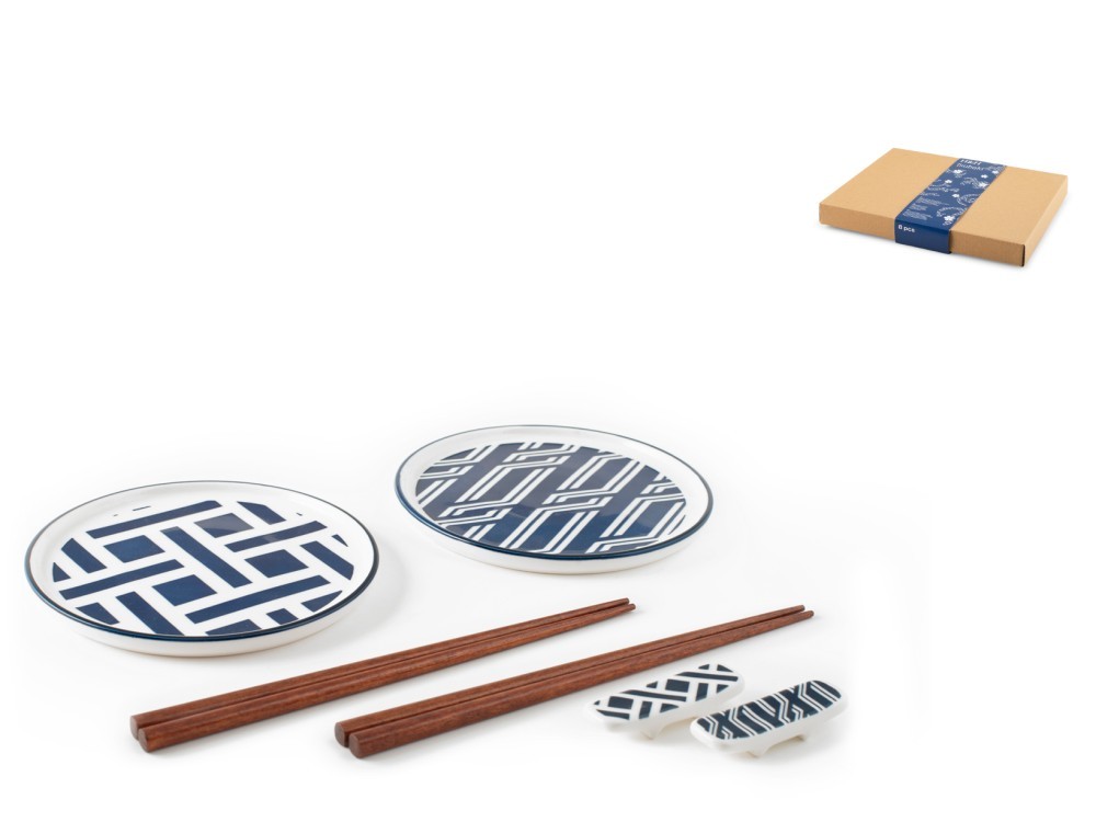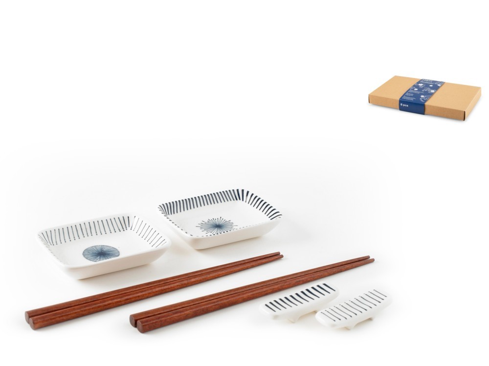 H&H Set Sushi 8 pièces, Tsubaki en porcelaine décorée - 2 tasses rectangulaires 9,5 x 7 cm + 2 paires de baguettes en bois + 2 baguettes apposées pour lave-vaisselle et micro-ondes