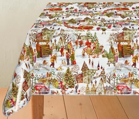 Nappe Toile Cirée de Noël - Tanabru Blanc – Nappe Festive Village de Noël – Imperméable Largeur 140 cm – Roulé sur Un Tube en Carton (sans Plis) (Rectangle 140 x 200 cm)