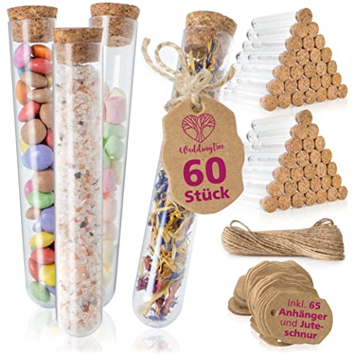 WeddingTree 60 x Tube à essai en plastique -17 x 105 mm - 20 ml - Avec corde de jute en liège et pendentif - Cadeau de mariage, verres à épices de décoration