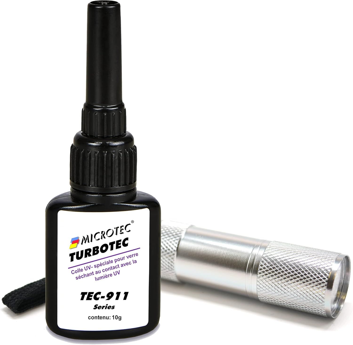 Turbotec 911 Colle spéciale pour verre l¿ extra-forte pour le verre/métal 10g avec lampe de poche UV colle séchant au contact avec la lumière UV et transparente