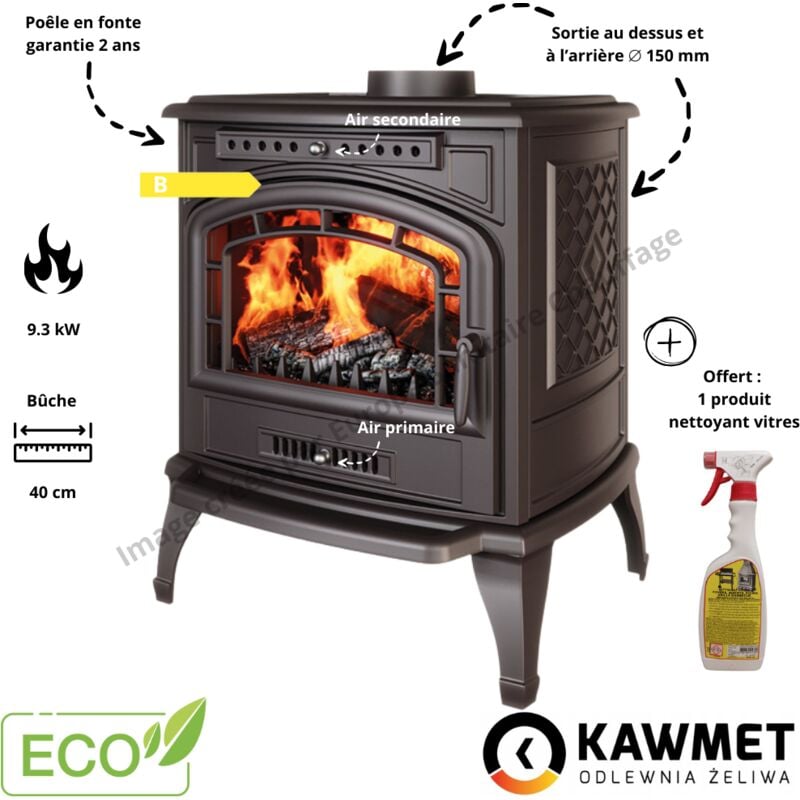 Poêle à bois en fonte 9.3 kW – Rendement 65,9 % – Longueur bûche 40 cm – Sortie fumée diamètre 150 mm – Pour surface jusqu'à 93 m²