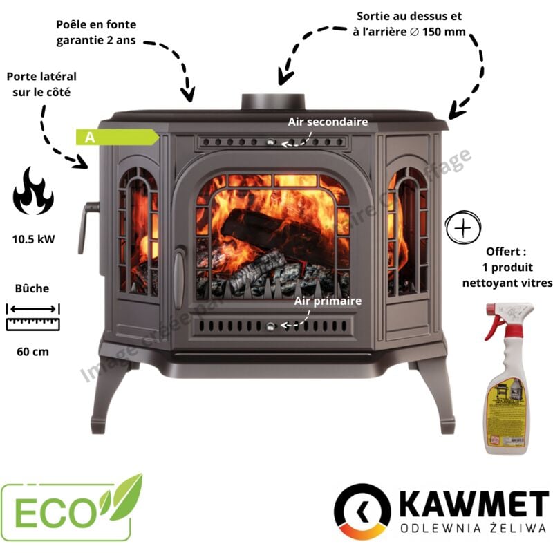 Poêle à bois en fonte 10.5 kW – Capacité de chauffage 105 m² – Rendement 73.5 % – Sortie de fumée 150 mm – Verre Robax résistant 800 °C