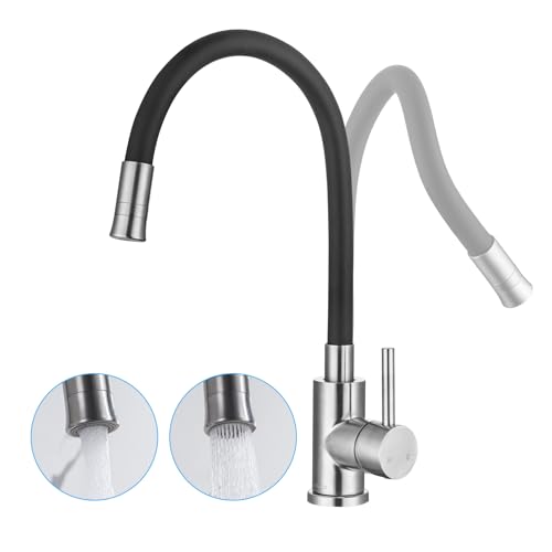 LakeBayMZC Robinet de Cuisine avec 2 types de jet d'eau, robinet de cuisine noir avec bec flexible, rotatif à 360°, robinet d'évier en acier inoxydable brossé et tuyau en silicone,Brossée