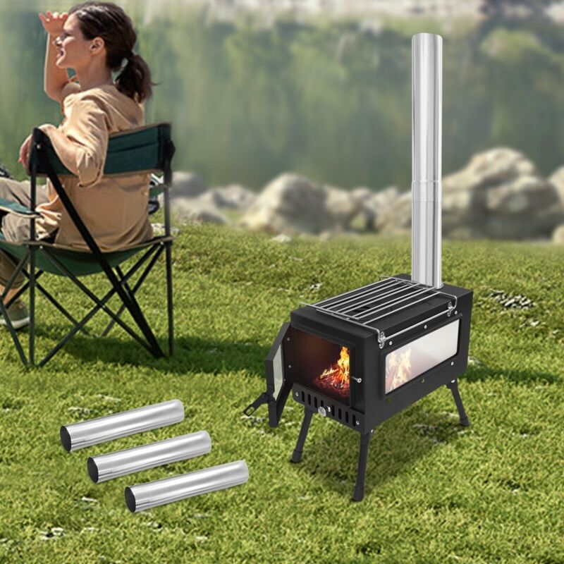 Poêle à bois de tente en acier inoxydable avec tuyaux de cheminée Poêle à bois de camping portable pour camping chauffage cuisson (argent)