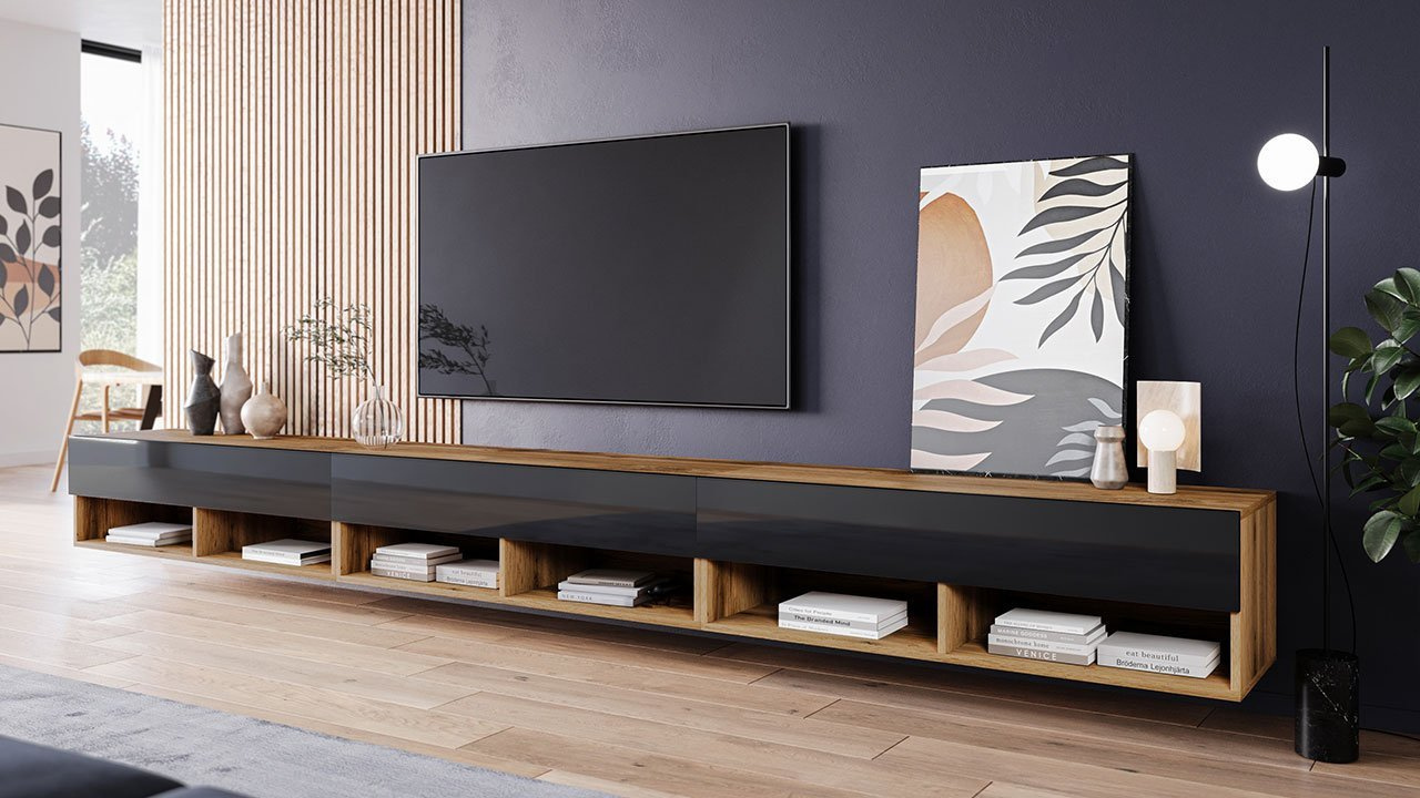 Meuble TV 300 cm WILLA A – chêne wotan / noir brillant