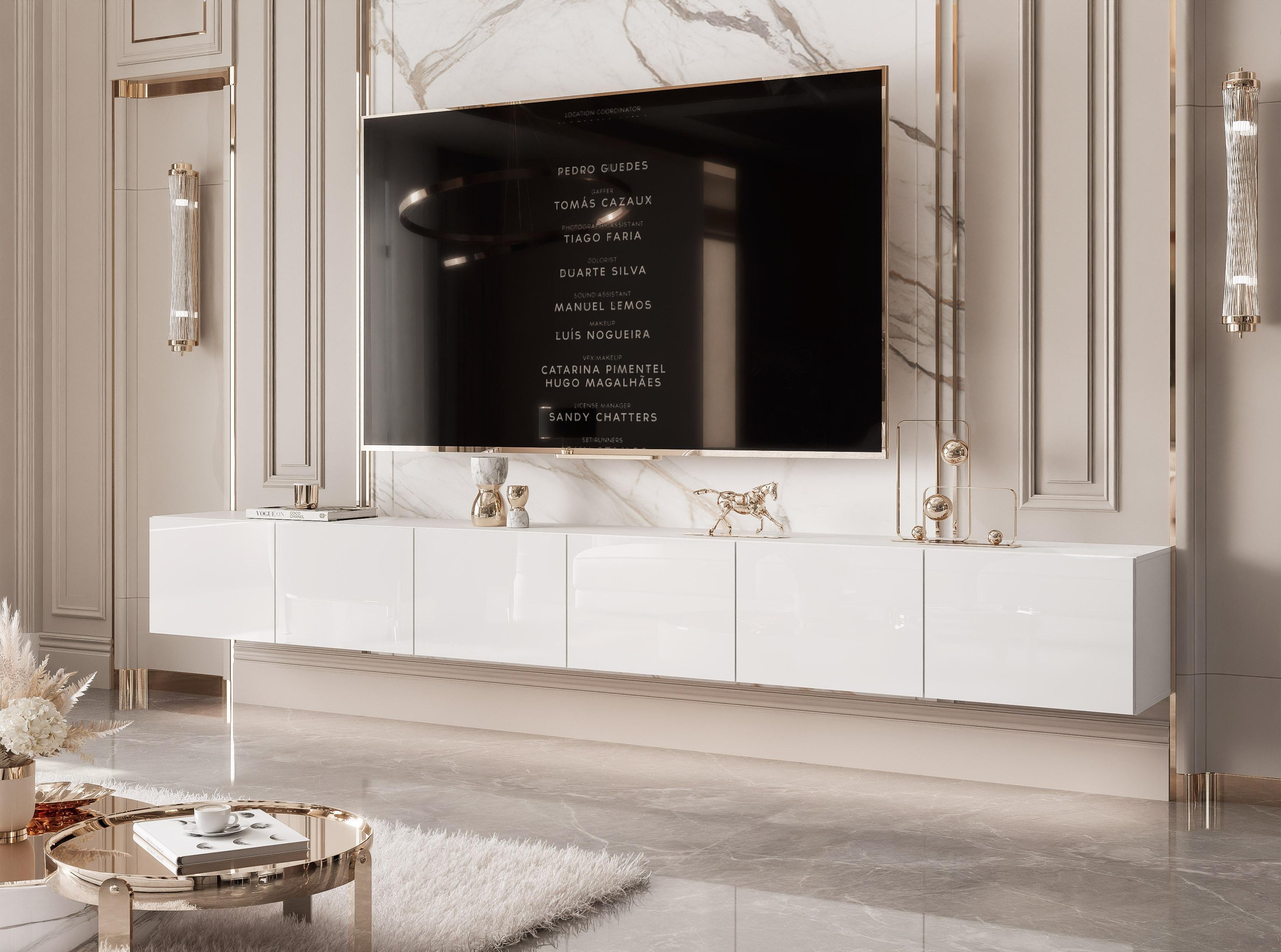 TV-Lowboard ANGEL 300 cm avec éclairage LED Meuble TV Salon Meuble média Meuble TV suspendu Blanc brillant
