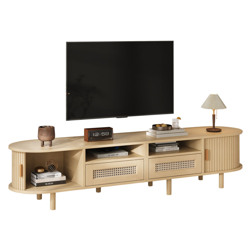 Meuble TV Ovale 170 Cm Bois Clair Avec Rattan, 2 Tiroirs Et Portes Coulissantes Pour TV 70''