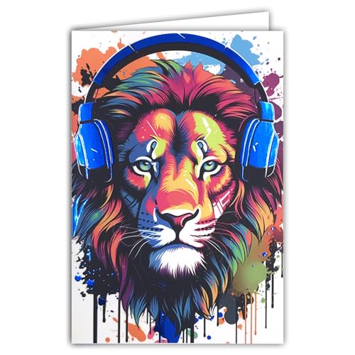 IETSCPMD-V19785 Carte Lion Fauve qui écoute de la Musique avec un Casque Audio Bleu Brillant - Avec Enveloppe Blanche Format 12x17,5cm -Carte ouverte intérieur blanc 23x17cm -Fabriqué en France