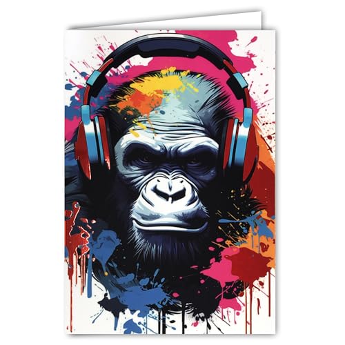 IETSCPMD-V19784 Carte Gorille Singe qui écoute de la Musique avec un Casque Audio Rouge Brillant - Avec Enveloppe Blanche Format 12x17,5cm - Intérieur blanc 23x17cm - Fabriqué en France -Anniversaire