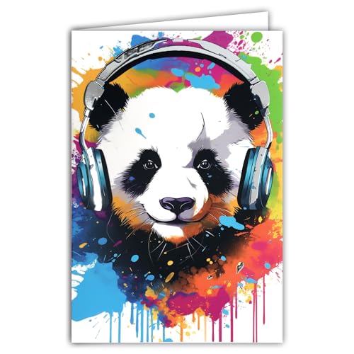 IETSCPMD-V19786 Carte Panda Mignon qui écoute de la Musique avec un Casque Audio Argenté Brillant -Avec Enveloppe Blanche Format 12x17,5cm - Intérieur blanc 23x17cm -Fabriqué en France -Anniversaire