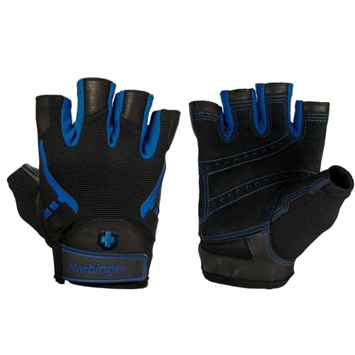 Harbinger Pro Gants de musculation- Flexible, léger et respirant, avec une paume en cuir rembourrée pour une prise ferme, parfait pour haltères, kettlebells et barres,S,Bleu