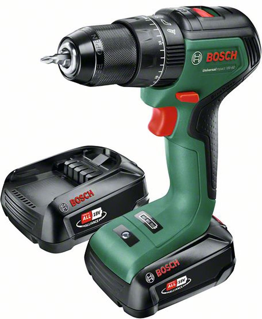 Perceuse à percussion sans fil Universalimpact 18 Bosch, capacité de batterie 2 Ah, tension de batterie 18 V, vitesse variable, 2 batteries lithium-ion et chargeur inclus