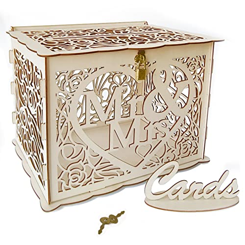 JaneYi Boîte à Cartes de Mariage en Bois Grande à Enveloppe 30x23x23cm Urne de Mariage Champêtre Tirelire avec Serrure et Fente pour Couples Fête d'Anniversaire - Mr & Mrs