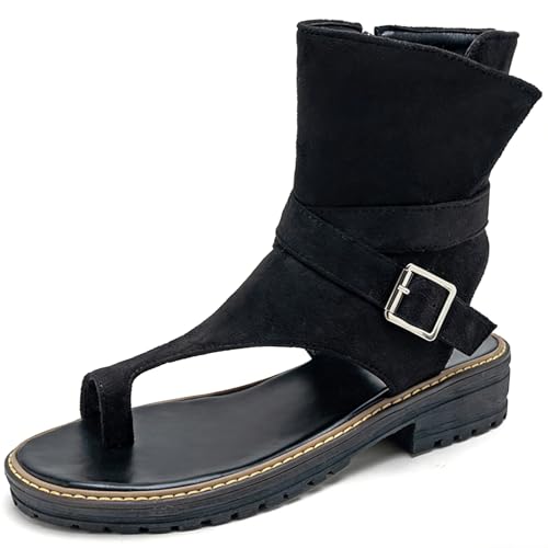 Noir,37 EU,Bottines Sandales Femme Entre Doigt Cheville Zip Cote Effet Daim Talon Bas Semelle Caoutchouc Marche Plage Vacances ete