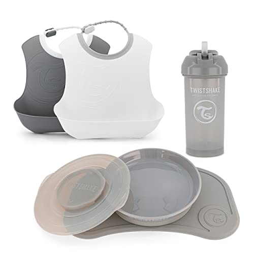 Twistshake Ensemble de Vaisselle pour Bébé - 5 Pièces | 1x Set de Table en Silicone pour Bébé - 1x Assiette Enfant - 2x Bavoirs - 1x Gobelet Paille | Ensemble D'alimentation pour Bébé | 6+ Mois | Gris