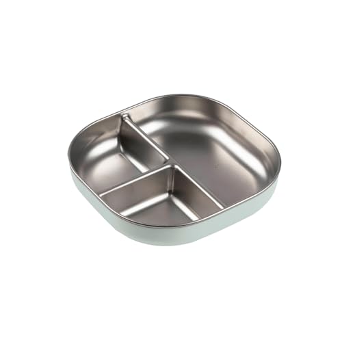 BÉABA, Assiette Bébé Compartimentée en Inox Micro-ondable – Antidérapante avec Housse Silicone, Incassable, Bords Hauts Ergonomiques, Passe au Lave-Vaisselle, Vert de gris