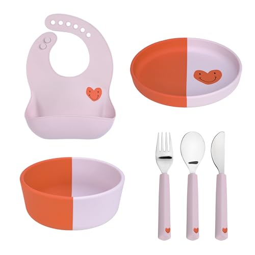 PandaEar Lot de 6 assiettes et ustensiles pour tout-petits, 2 assiettes en silicone avec ventouse et 4 fourchettes en acier inoxydable pour bébé, vaisselle pour bébé