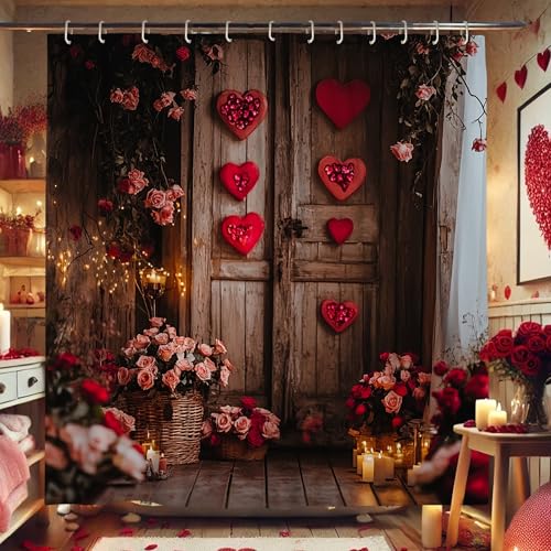 Rideau de douche romantique en forme de cœur, style vintage avec porte en bois marron pour décoration de vacances, Saint-Valentin, rideau de douche moderne rustique en tissu imperméable avec crochets
